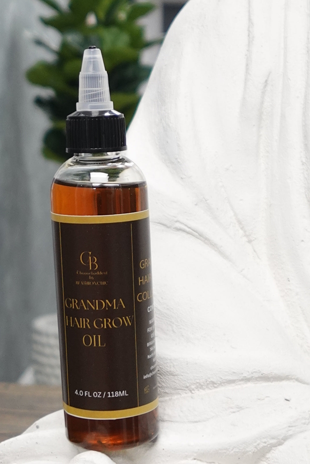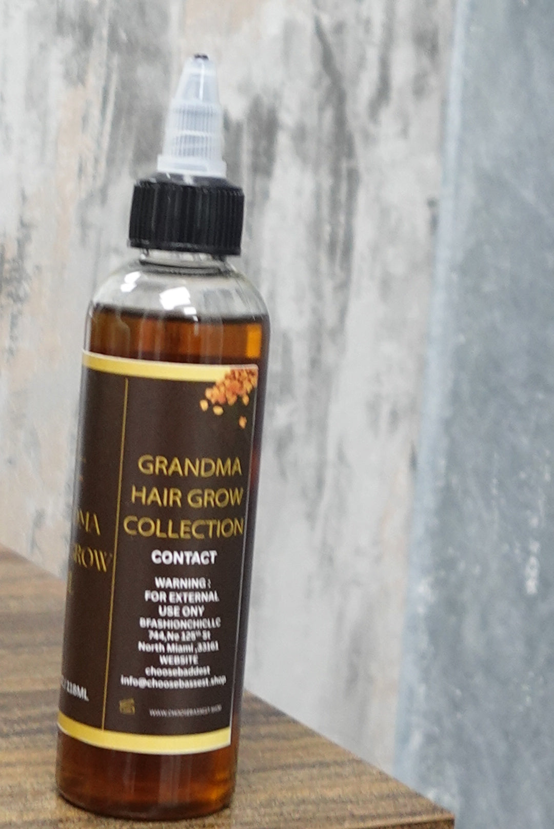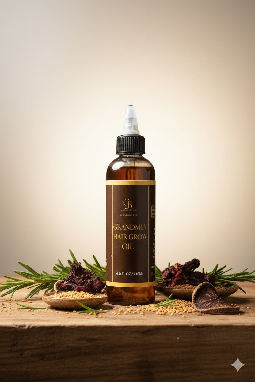 Grandma Hair Grow Oil is a powerful blend of Haitian black castor oil, coconut, amla, avocado, Egyptian fenugreek oil, and serum. This unique mix stimulates hair growth and strengthens follicles for healthier, fuller hair. Say goodbye to thinning and hello to healthy hairs with our all-natural formula.